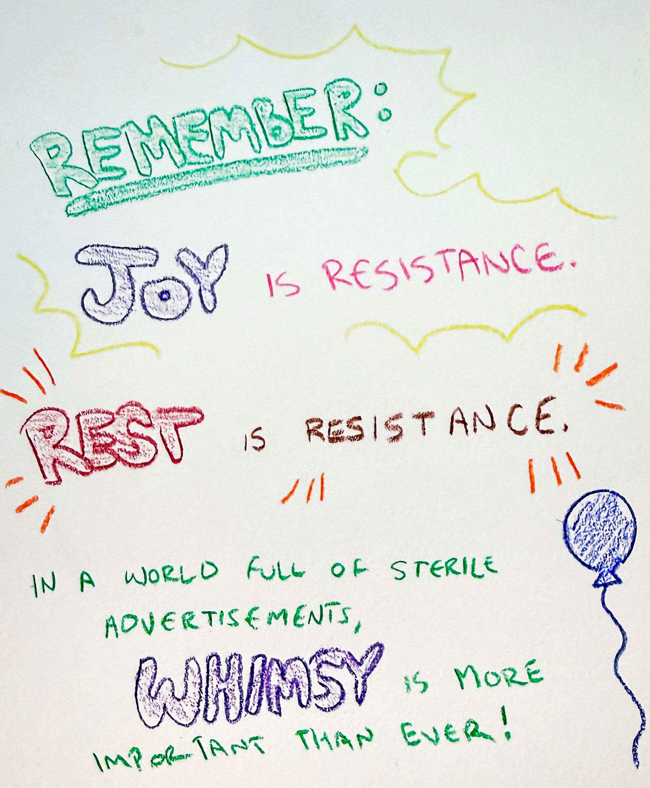 Remember: Joy is resistance. Rest is resistance. In a world full of sterile advertisements, WHIMSY is more important than ever!